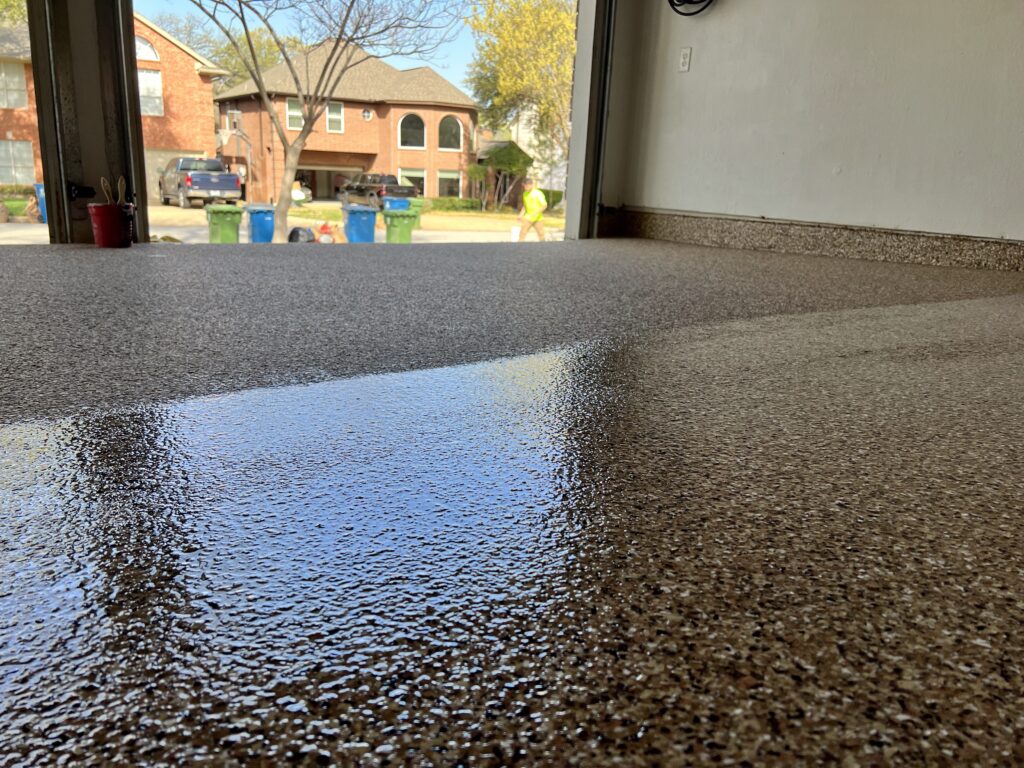 A high-quality epoxy system withstands the expansion and contraction that Dallas concrete experiences throughout the year. It resists hot-tire pickup, UV exposure, and heavy wear from daily use.